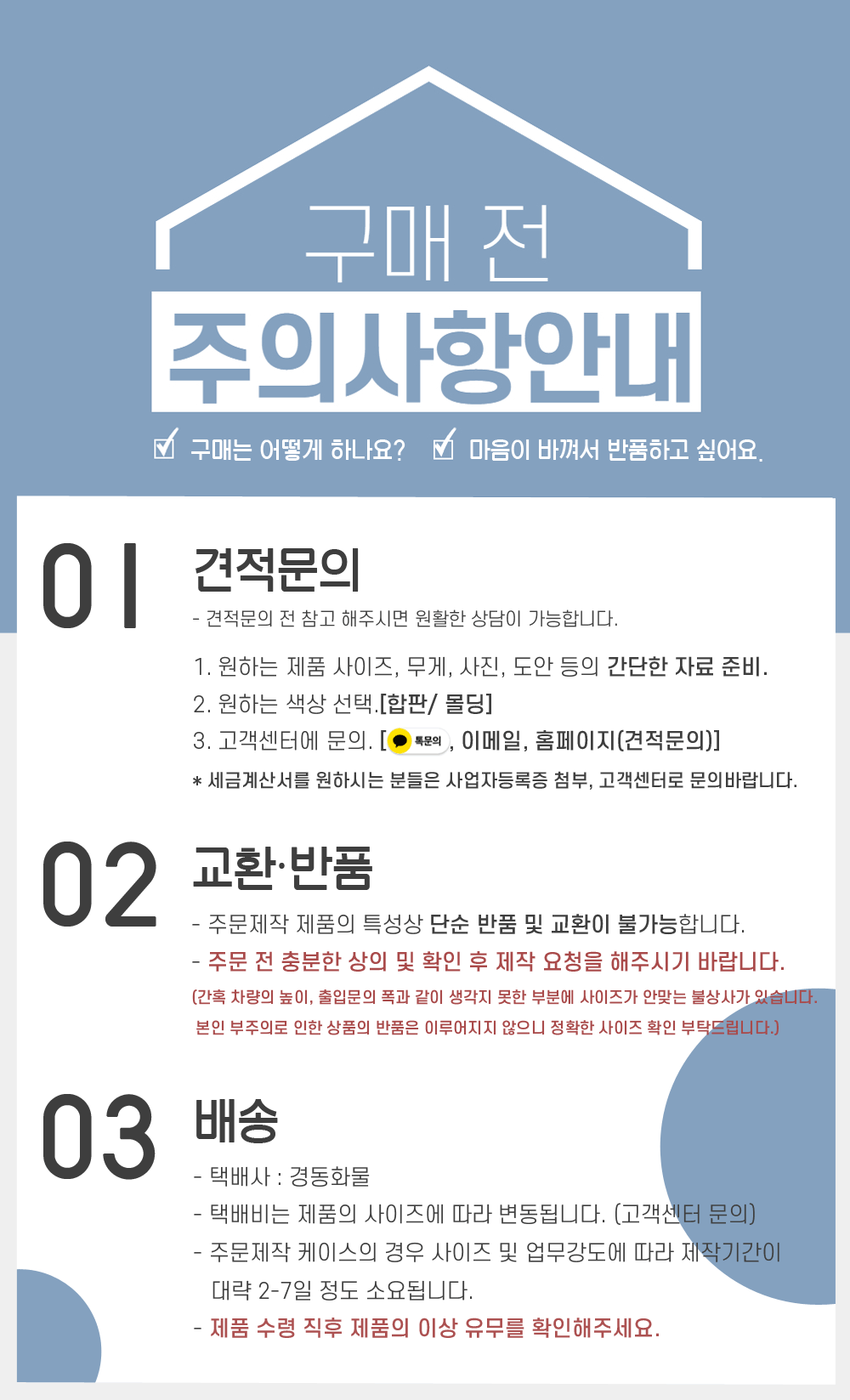 - 주문제작 제품의 경우 상품의 크기와 디테일에 따라 제작기간이 2~7일 소요될 수 있음을 알려드립니다.
